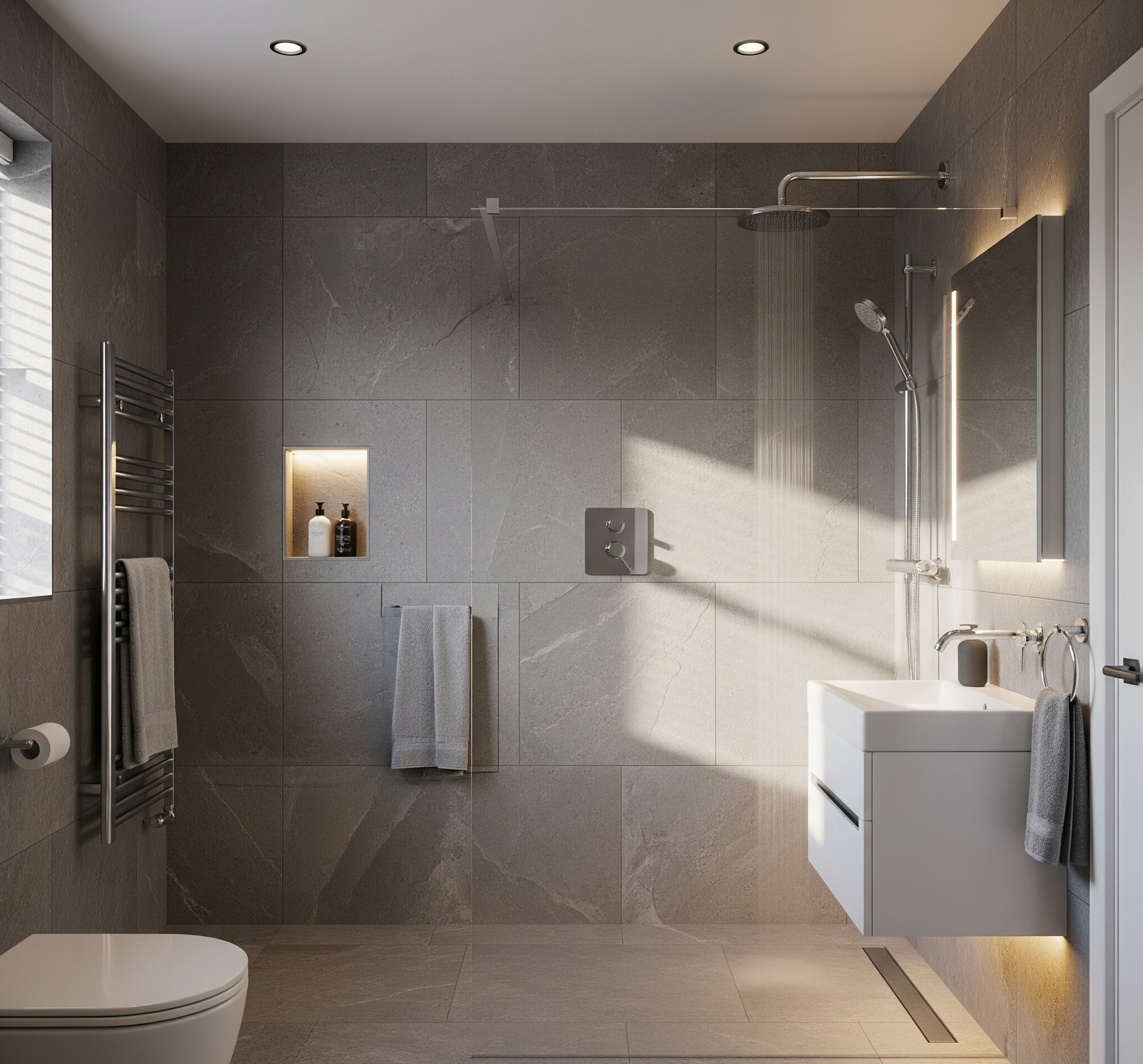 A true wet room is a fully waterproofed (or ‘tanked’) room where the floor itself acts as the shower base. The floor has a slight gradient, guiding water to a flush-mounted drain. This creates a completely level-access, seamless space.